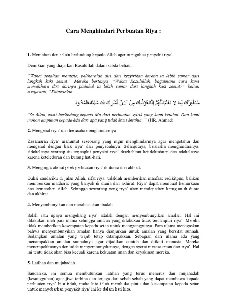 Ada pun cara lain untuk menghindari sifat riya antara lain: 4 cara menghindari perilaku riya riya bukanlah penyakit yang tidak dapat diobati. Sebab pada dasarnya sifat manusia itu senang dipuji.